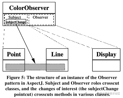 在AspectJ版本中,与观察者和主题之间的关系相关的所有代码都被移动到一个方面中,这改变了模块之间的依赖关系。图5显示了这种情况的结构。