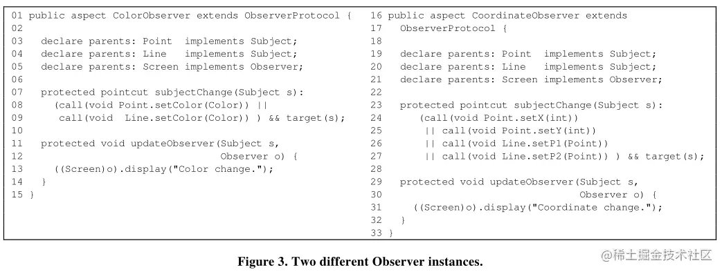 感兴趣的变化描述了概念操作,即程序执行中的一组点,在这些点上,主体应该更新其观察者(以通知他们其状态的变化)。在AspectJ中,这类点的集合用切入点构造来标识。在可重用方面,我们只知道有感兴趣的修改,但我们不知道它们是什么。因此,我们定义了一个名为subjectChange的抽象切入点,它将被实例特定的子方面具体化(第28-29行)。