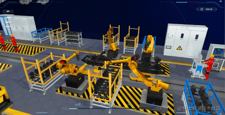 页面初始化时,画面视角放在远处,然后通过动画将视角由远及近拉到生产线工位1的位置。在整个动画过程中,首先可以预览到生产线的全局,最后画面具体到初始工位上。