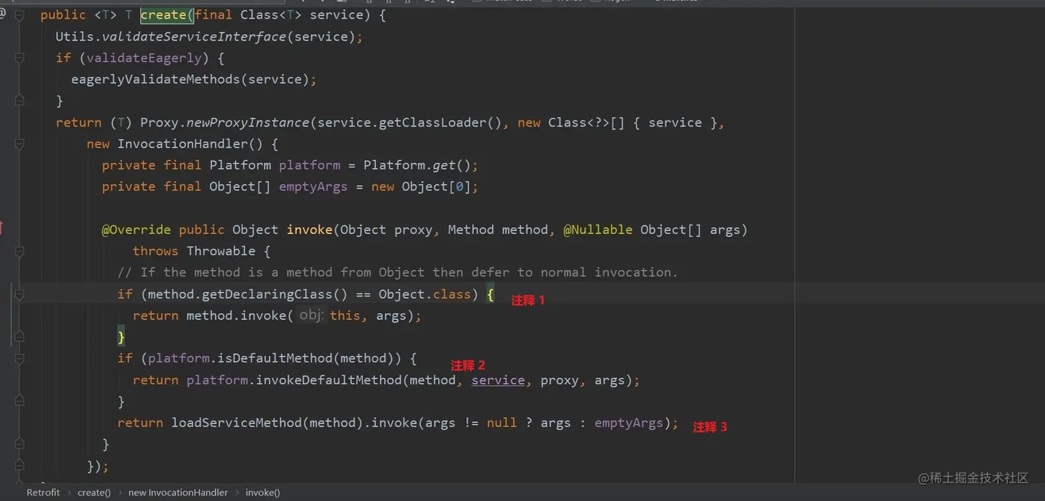 我们调用ApiService方法时,会走到动态代理的invoke,也就是目前分析的 create 方法里的动态代理invoke方法