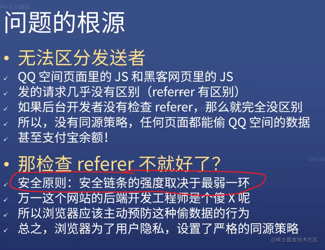 - 因此需要检查对方网站的referer,确认是白名单中的网站才让它跨域
