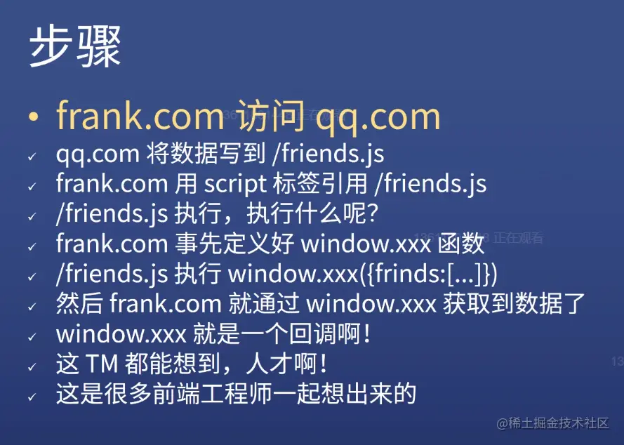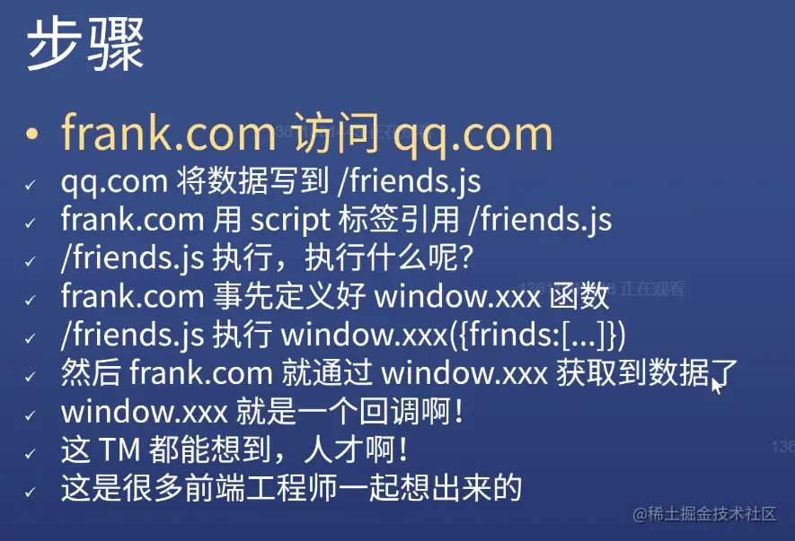 域A的网站原本想要访问域B的json文件,但是由于跨域了,因此域A需要用js动态创建script标签以访问域B的js文件,域B后端接收到请求之后需要准备一个js文件,将原本要返回的json数据解析成js对象然后重新渲染到js文件中,再把这个js文件返回给网站A。