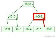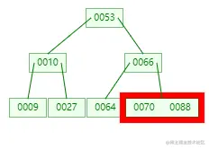 节点分裂:本来应该和 [70,88] 在同一个磁盘块上,但是当一个节点有 3 个关键字的时候,它就有可能有 4 个子节点,就超过了我们所定义限制的最大度数 3,所以此时必须进行分裂:以中间关键字为界将节点一分为二,产生一个新节点,并把中间关键字上移到父节点中。