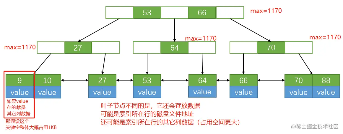叶子节点一个关键字占用1KB时,那一个节点就可以放16个元素,当整棵树叶子节点全部都被撑满时,通过计算 1170 × 1170 × 16 = 21902400