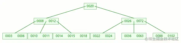 二叉树是每个节点上有一个关键字和两个分支,B-tree 上每个节点有 k 个关键字和 (k + 1) 个分支。