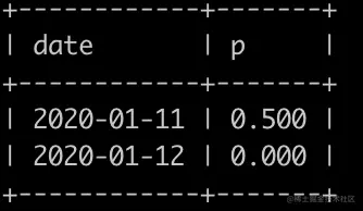 结果表示: 2020-01-11失败的概率为0.500,因为email的第1条数据,发送的用户id为2是黑名单用户,所以不计入统计,正常用户发正常用户总共2次,但是失败了1次,所以概率是0.500; 2020-01-12没有失败的情况,所以概率为0.000. (注意: sqlite 1/2得到的不是0.5,得到的是0,只有1*1.0/2才会得到0.5,sqlite四舍五入的函数为round)