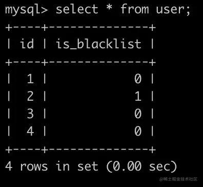 下面是一个用户(user)表,id为主键,is_blacklist为0代表为正常用户,is_blacklist为1代表为黑名单用户,简况如下:
