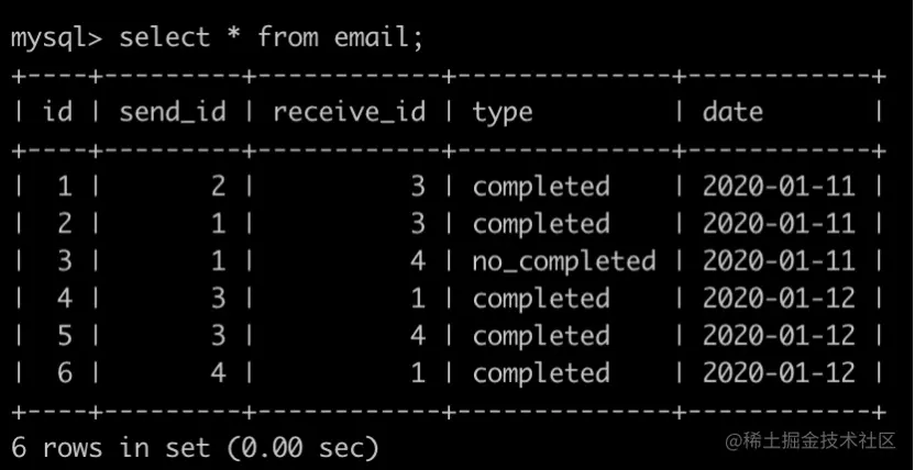 第6行表示为id为4的用户在2020-01-12成功发送了一封邮件给了id为1的用户;