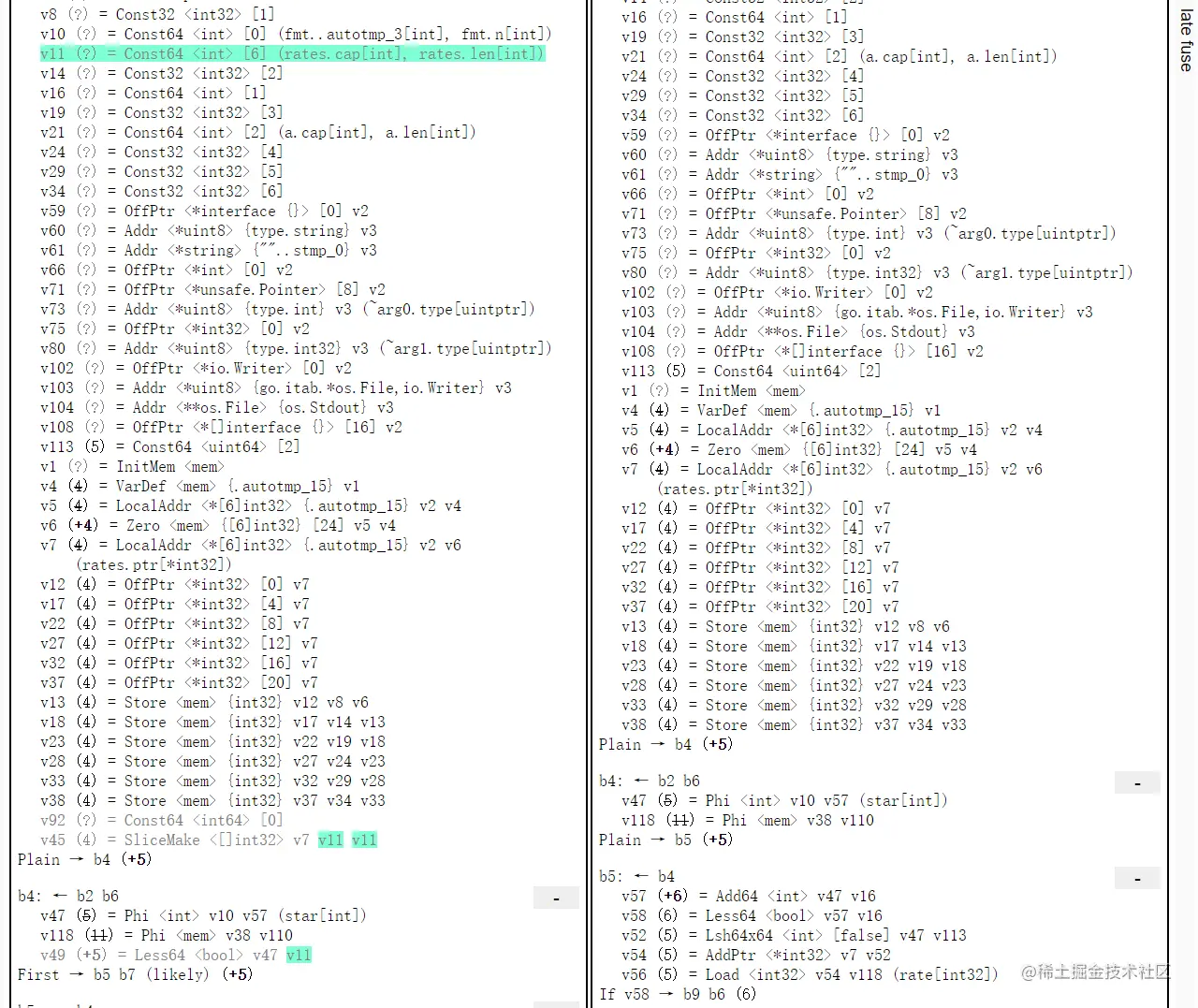 - 编译优化。在生成了 SSA IR 之后,编译器会基于这个 IR 跑很多趟(pass)代码分析和改写,每个 pass 会完成一个优化策略。另外值得一提的是,Go 中很多强度削减类的策略是使用一种 DSL 描述,然后代码生成出实际的 pass 代码来的,不过这块跟今天内容没什么关系,感兴趣的同学可以下来看看。在文章的后续内容中,我们就会定位到导致本文中这个 bug 的具体的 pass,并看到那个 pass 中有问题的逻辑。