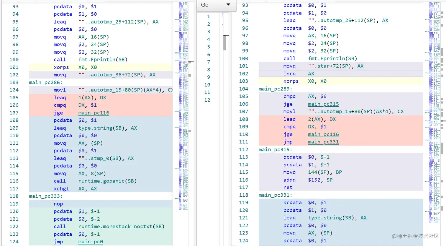 首先,我们要定位到这个问题具体的直接原因。简单来说,这个 bug 是 for-range loop 越界,原本循环应该在循环次数到达数组长度后终止,但是这个复现程序中的循环无限执行了下去。乍一看,问题像是有 bound check 被优化掉了,那么我们来实锤一下。有一个方便的网站,可以在线观察给定程序编译产出的汇编结果,我用 这个网站 分别生成了原复现程序和将第六行的 +1 改为 +2 后不复现程序的汇编,供大家对比。抛开无关细节不提,可以很容易地看到前者的汇编相较于后者的确少了一次判断,导致循环无法终止,具体的位置是第二段代码的 105 行: