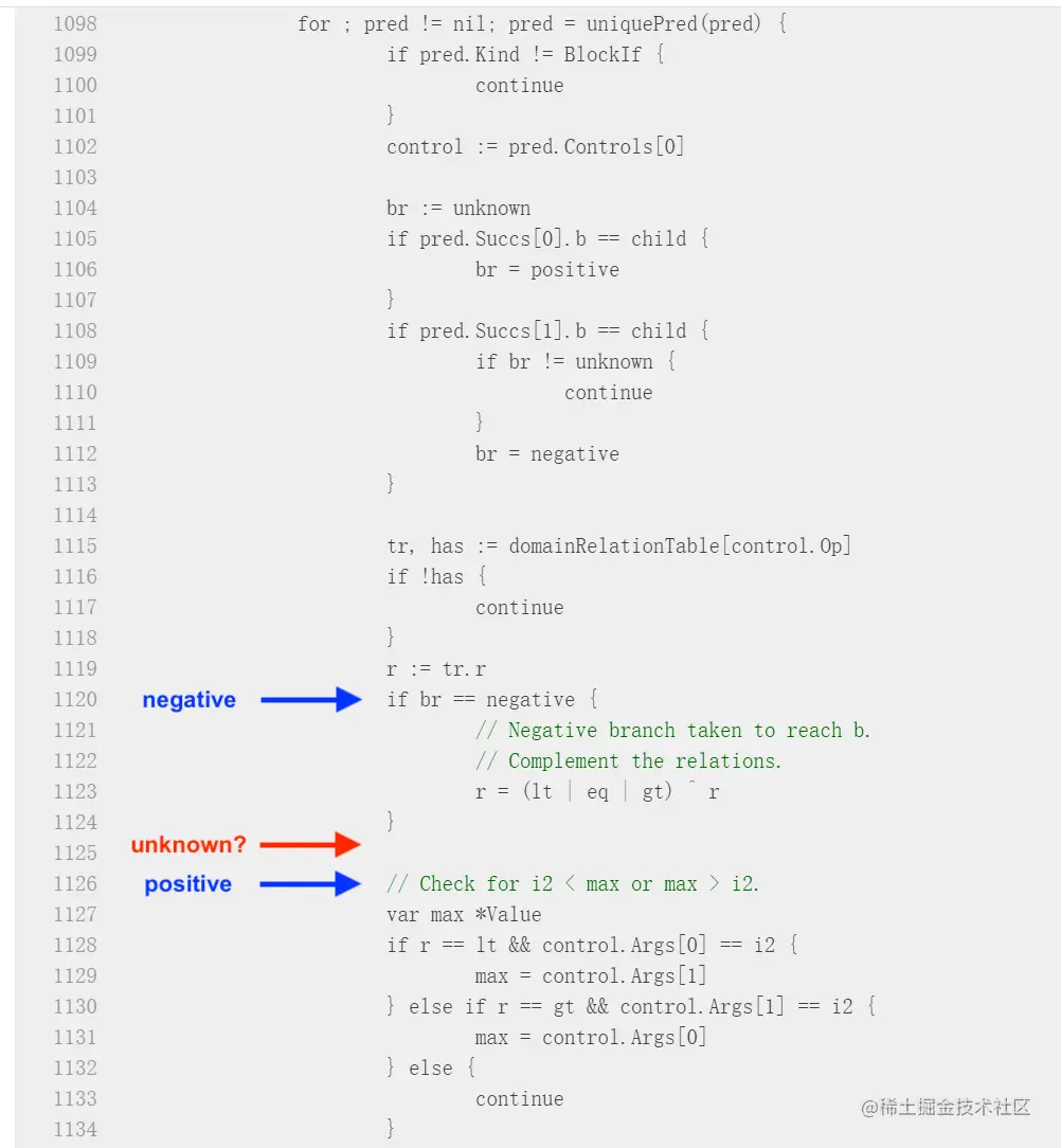 读 addLocalInductiveFacts 的 抽取 max 的相关代码(如上图片段)可以看出,这里的意图其实就是从条件判断结束后循环头部的 phi 操作所在 block 出发,一路向前追溯,找到条件判断的 block(if block),然后如代码中 1104 行,判断 phi 操作究竟是 if 的条件成立分支逻辑,还是 else 逻辑,根据分支来判断是否应当对条件进行取反,因为如果是 else 分支逻辑,那么意味着条件判断结果是 false,我们需要对条件取反才能得到真正成立的逻辑条件。 看到这里的代码,相信大家已经知道了这个 bug 的根因所在。1104-1113 行代码写的很清楚,如果是条件成立分支,那么 br 为 positive,如果是 else 分支,那么 br 为 negative。但是,这里并没有判断 phi 操作跟 if block 的间接关联,如果 phi 操作跟 if block 没有直接联系,那么即使我们追溯到了 if block,也没法知道 br 变量究竟是 positive 还是 negative,取值就是 unknown。但是在后续逻辑中,并没有判断 unknown,而是直接默认按照 positive 的流程走;恰好在这个 bug 复现程序中,phi 操作所在 block 跟 if block 的 else 分支有间接关联,走 positive 流程自然就出了问题。