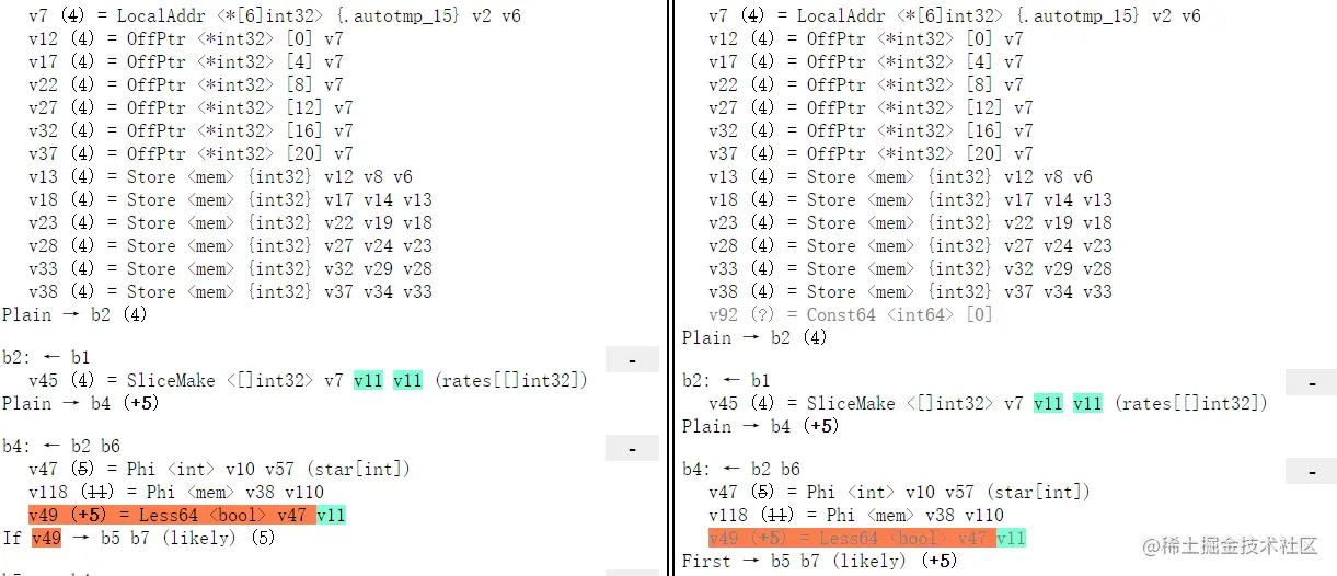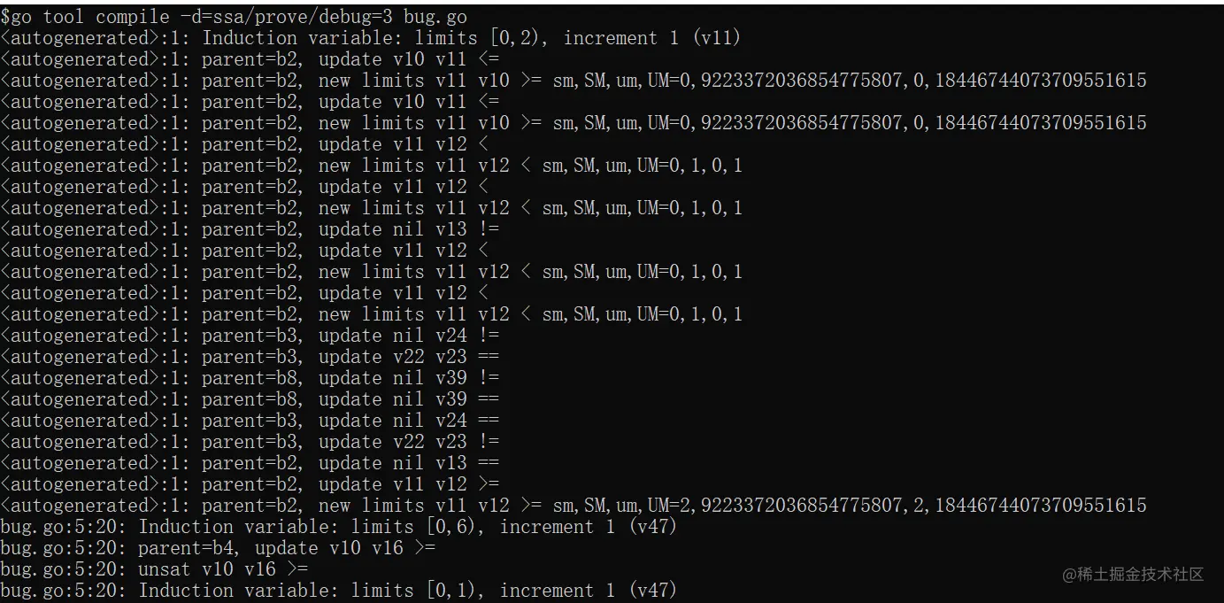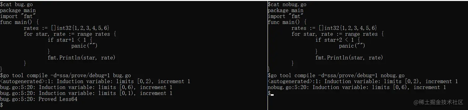 说起代码问题的定位方法,可能大体上能够分成三个流派。第一是打日志,通过在日志中加信息来定位问题;第二是通过 gdb 等 debugger 下断点、单步运行来排查问题;第三是动态追踪,通过 perf/systemtap/ebpf 之类的手段来动态观测程序运行时的行为。具体到 Go 编译器这里,其实开发 Go 编译器的 Go team 大牛们也需要日常排查问题,也不外乎这几种手段,但是在编译优化的问题上他们更青睐第一种打日志的方式,所以他们已经在各个 pass 中预埋了许多 debug 日志,只是这些日志平常不会开启,需要特殊的编译开关。既然 prove pass 相当复杂,我们不妨通过查日志的方式来进一步缩小问题排查范围。prove pass 的 debug 日志开关是 -d=ssa/prove/debug=1,其中 debug 后面跟的数字越大日志越详细,我们只需要在编译时执行 go tool compile -d=ssa/prove/debug=1 bug.go 就能看到对应的日志。 具体到这个 bug,用 debug=1 的级别能够看到对比。如下图,左侧为复现程序的日志,右侧为修改常量后不复现的程序的日志: