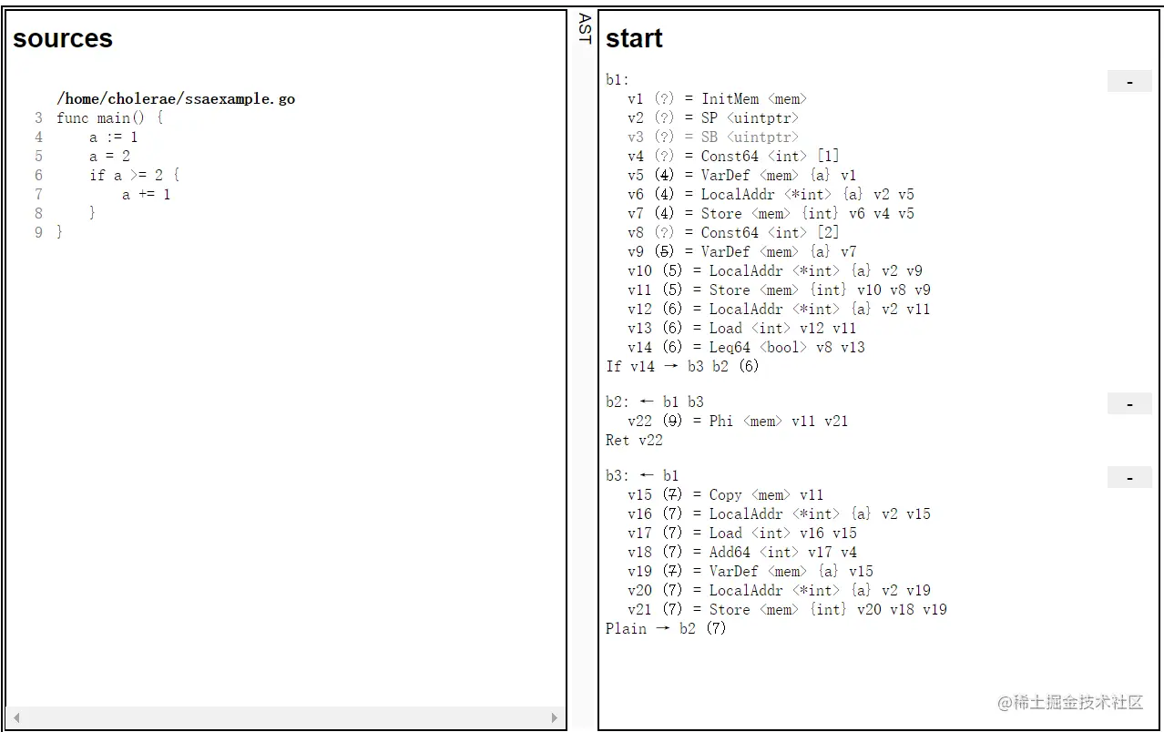 这里是一个简单的例子,右侧是 Go 代码所对应的 SSA IR。可以看到,整个代码被切分成了多块,每个代码块 (block)的代码以 bXX 作为开头,另外在缩进所对应的结尾能够看到这个 block 会跳转到哪个 block。在 block 内部,可以看到包括常量在内的每个值都会有一个单独的名字,比如变量 a 在 Go 代码的 4、5 行的两次赋值,在 SSA IR 中对应了 v7 和 v11 两个值。