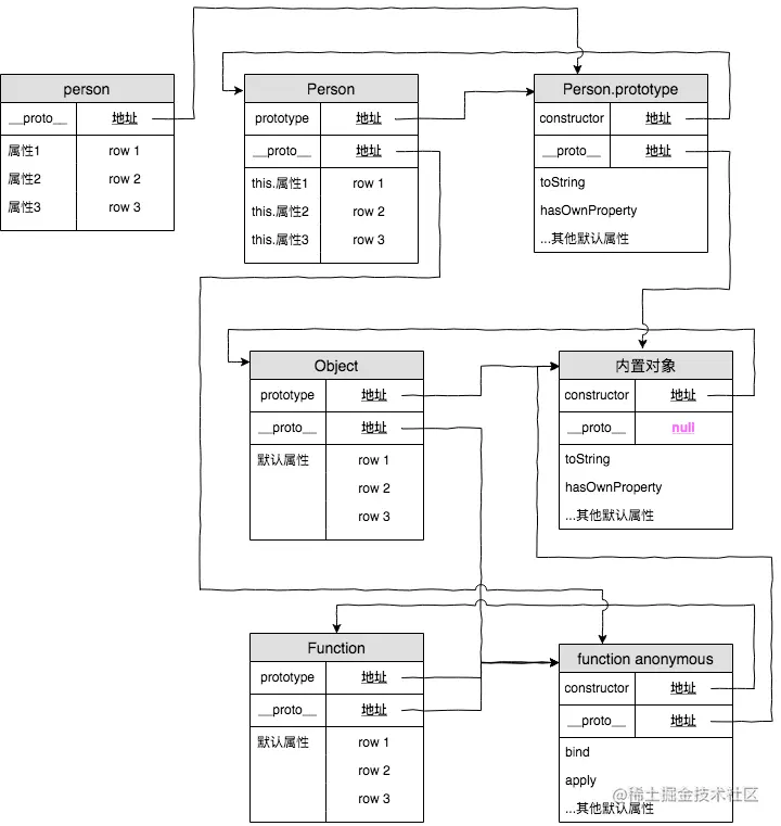 而 Person.__proto__ 指向内置匿名函数 anonymous,因为 Person 是个函数对象,默认由 Function 作为类创建,而 Function.prototype 为内置匿名函数 anonymous。