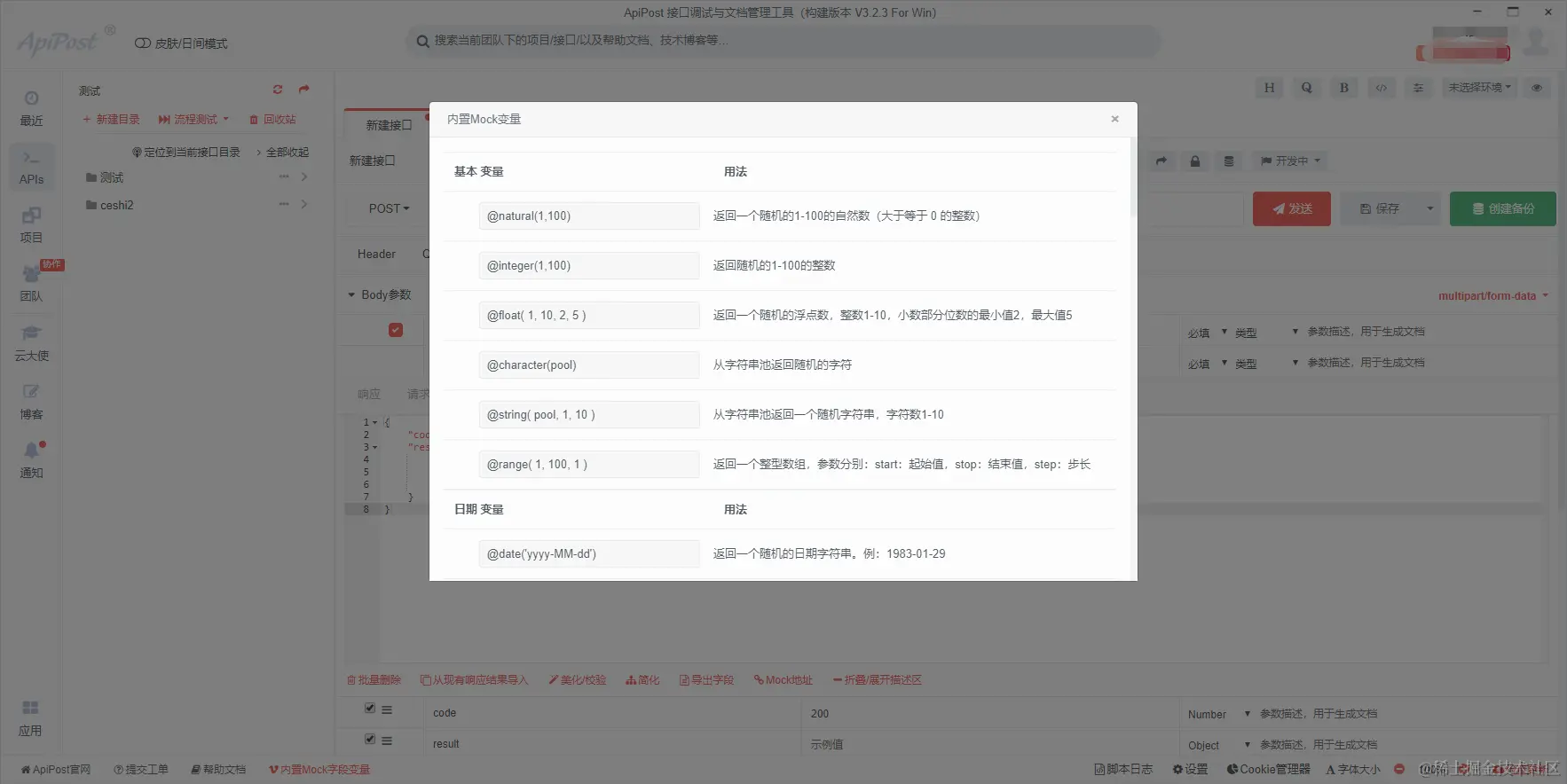 在进行接口测试的时候会需要生成一些随机数据进行测试,今天教大家使用apipost自带的mock字段变量生成随机数据进行测试。