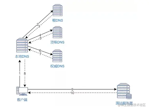 本地 DNS 依次向根服务器、顶级域名服务器、权限服务器发出请求,得到网站服务器的 IP 地址。