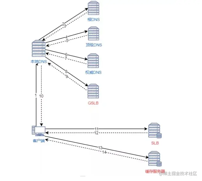 本地 DNS 依次向根服务器、顶级域名服务器、权限服务器发出请求,得到全局负载均衡系统(GSLB)的 IP 地址。