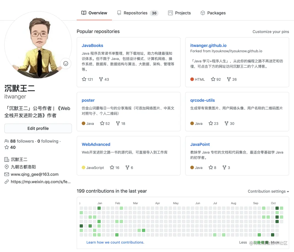 一股秋风瑟瑟的清冷感扑面而来,有没有?可能巨佬不屑于维护他的 GitHub 主页吧?我的 GitHub 主页够凄惨了,没想到巨佬比我还惨,终于可以吹牛逼地说,“我,沉默王二,GitHub 主页比 SLF4J、Log4J 和 Logback 的作者 Ceki Gulcu 绿多了。。。。。。”