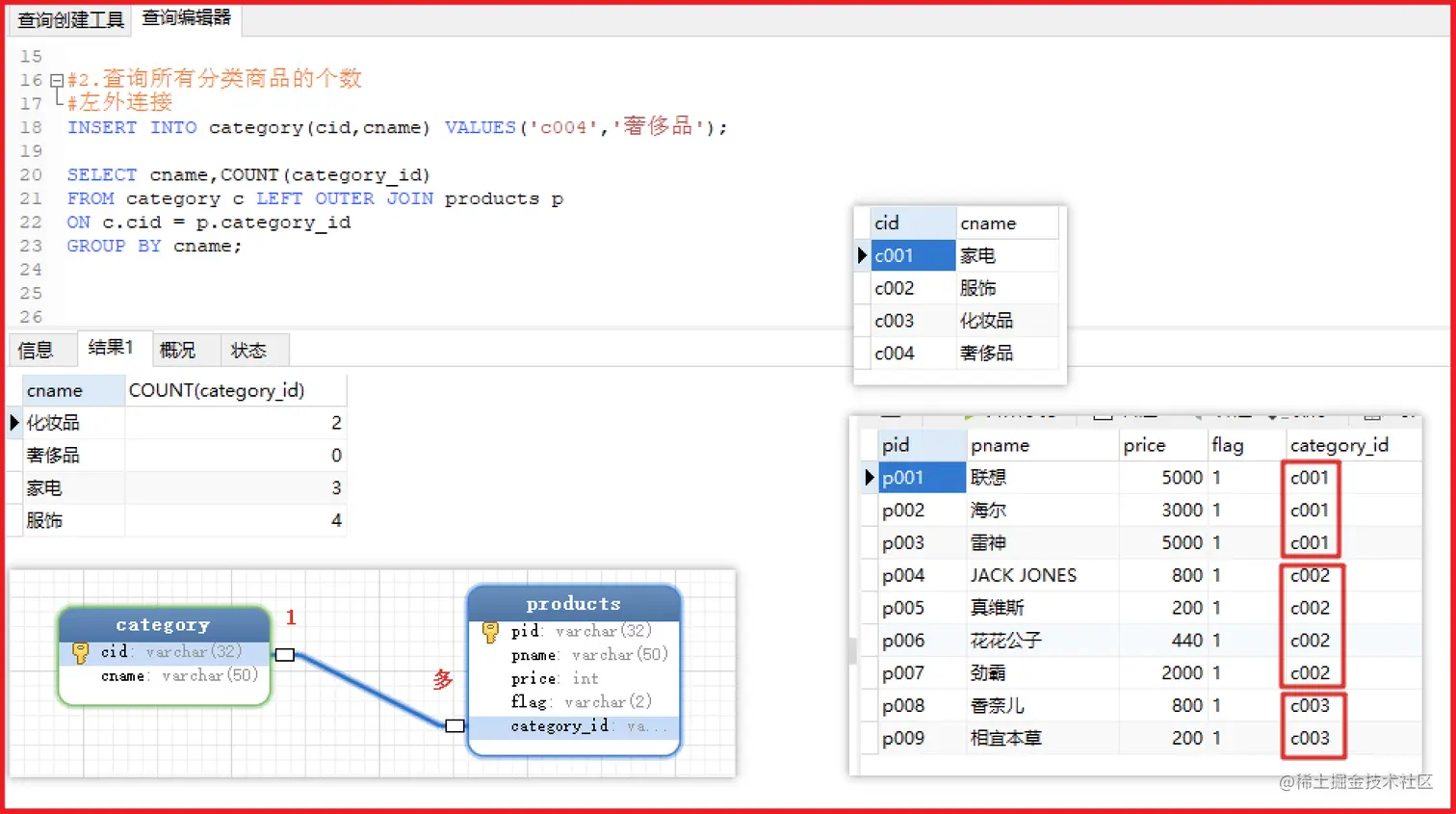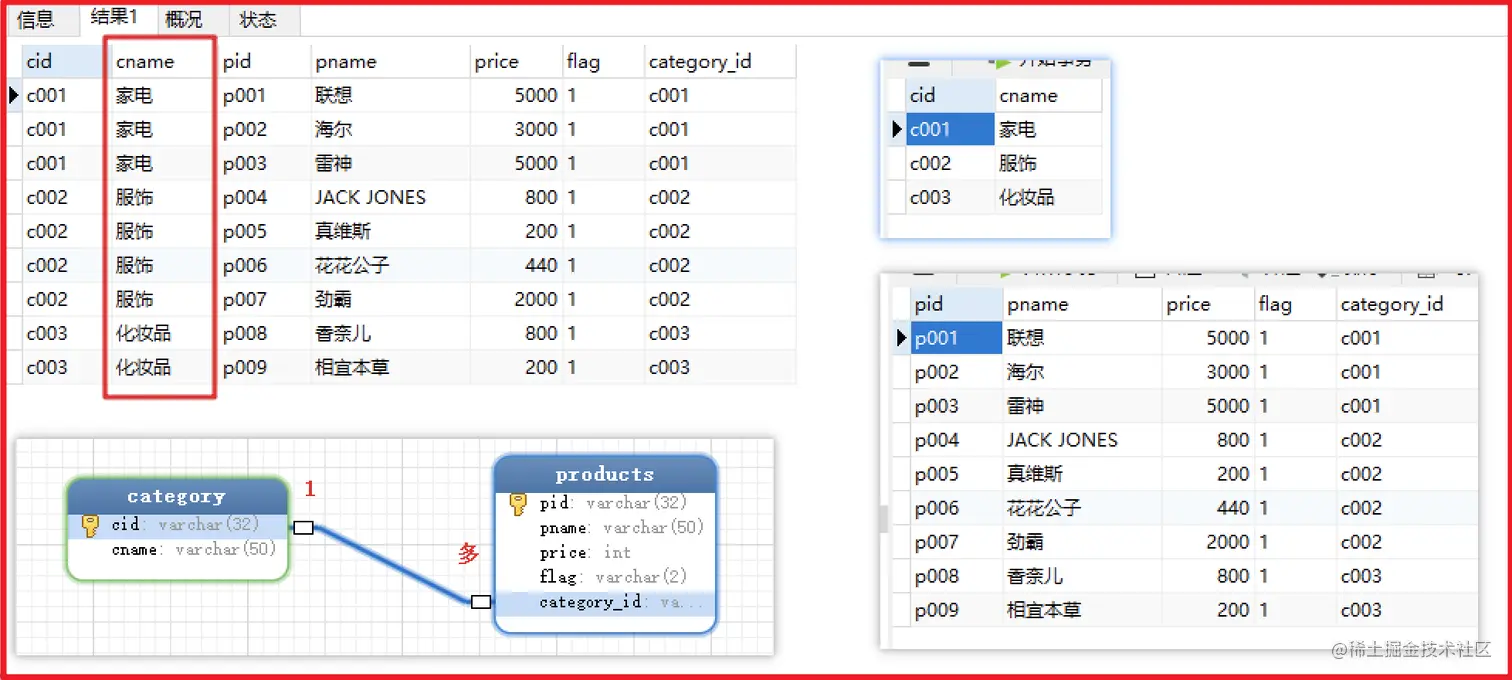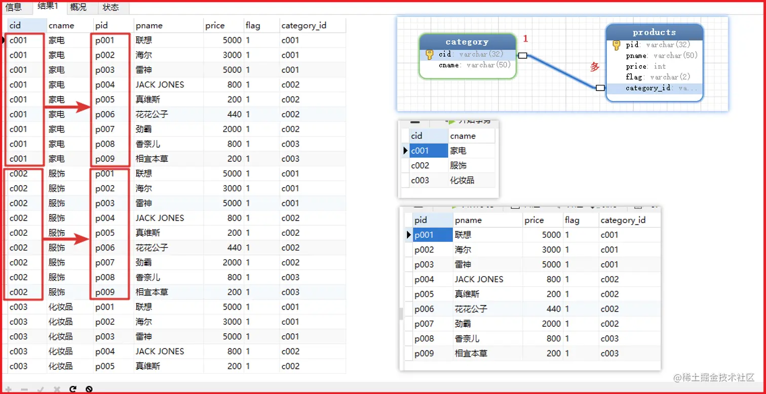 - 效果: category表中每条记录, 与 products表中每条记录分别连接
