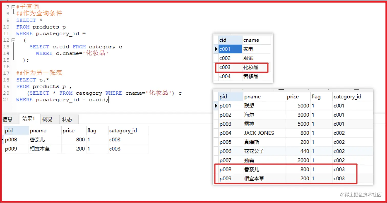 一条select语句结果作为另一条select语法一部分(查询条件,查询结果,表等)。 语法: