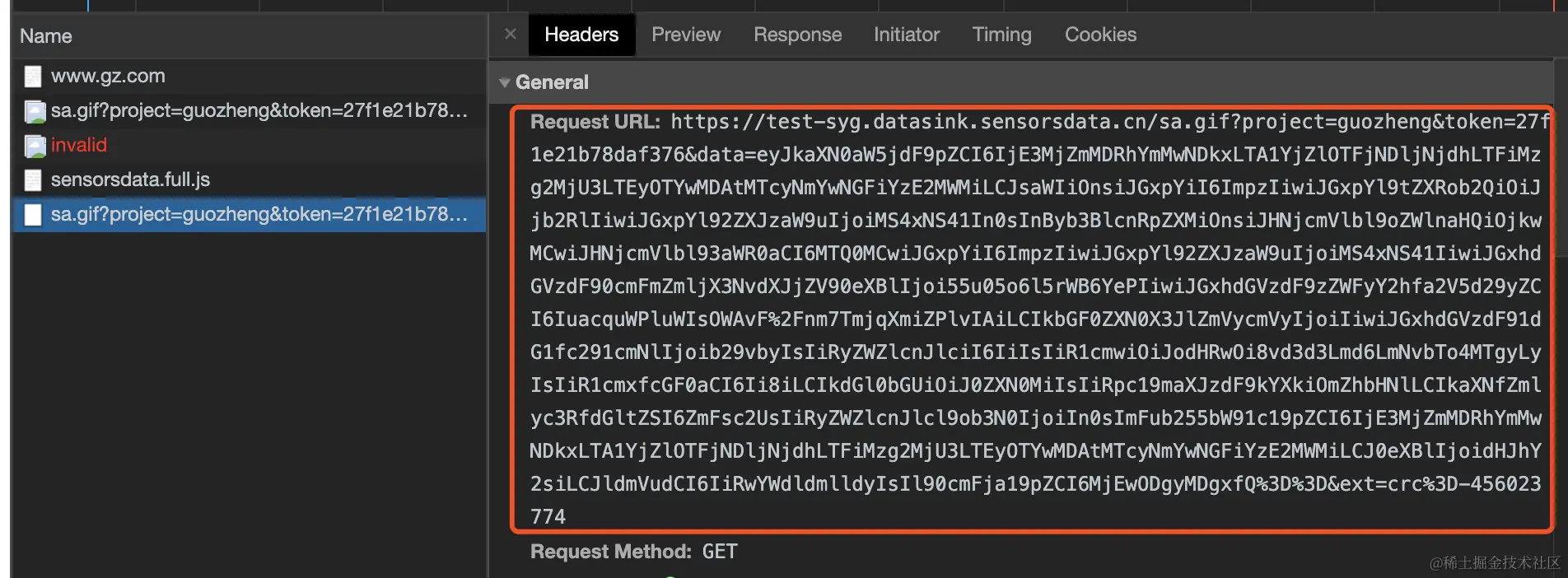 Web JS SDK 采集的数据,默认使用 image 方式发送数据,GET 请求的数据接收地址和数据体都包含在请求的 URL 中,如图所示:
