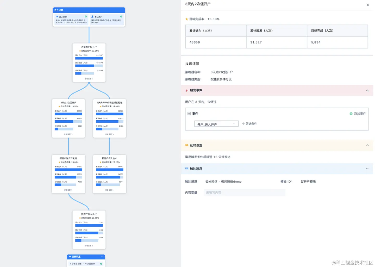其次根据相应的客户状态基于神策智能运营做个性化的触达动作,如“提供开户大礼包”、“提供新客户理财”、“推荐新客户定投”等,如下图,可以进行一些定时触达或触发触达等: