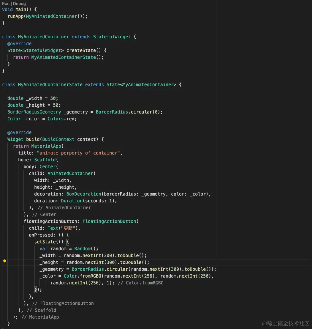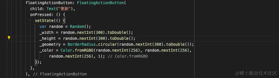3, 触发动画重新构建新的属性, 创建一个Scaffold对象,把创建的AnimatedContainer组件赋值给Scaffold对象的body属性,为了让动画在屏幕中间显示,选择Center组件包裹AnimatedContainer,创建一个FloatingActionBarButton对象,显示文本为Text 更新,实现点击onPress事件,动态的修改宽、高、颜色、以及corner,这些变化都应包含在setState函数当中,才会触发Flutter Engine重新初始化页面
