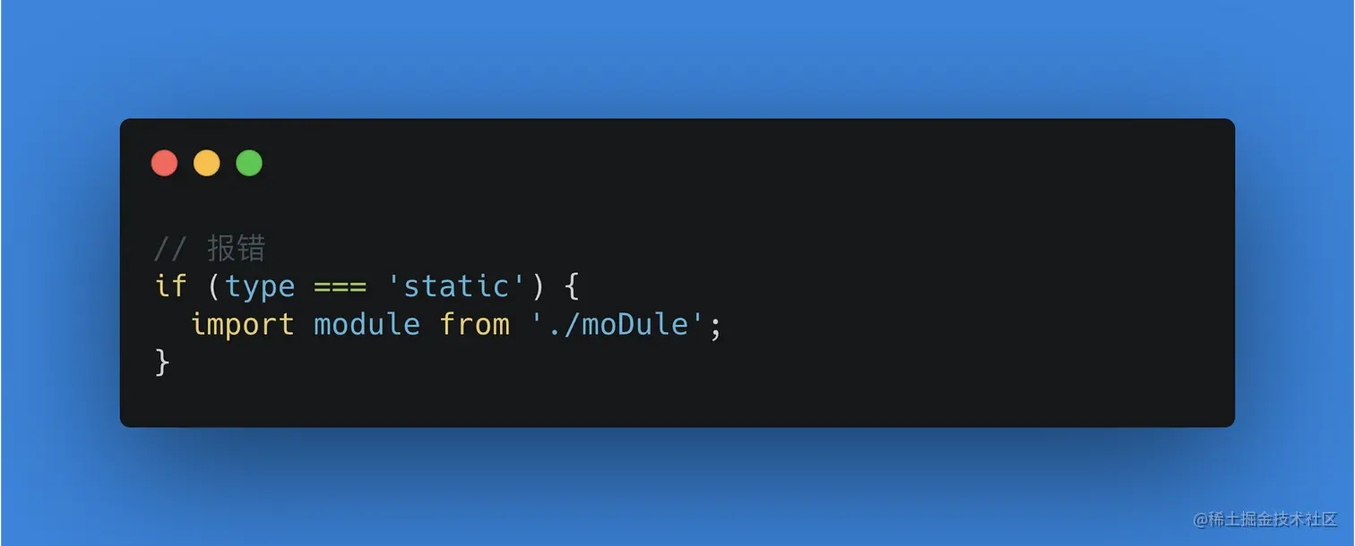 我们先看上面这段代码,有没有错。上一节讲过,import在js引擎处理时,是在发生编译的阶段。而这个阶段是不会去分析或执行这个if语句,所以import语句放在if中是没有任何意义的,会报语法错误,也就是说import和export命令只能在模块的顶层。