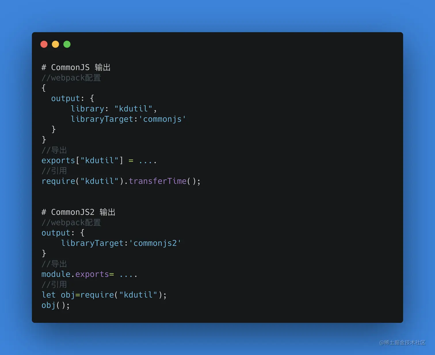 假设你现在有一个场景:你需要开发一个工具库,一个util的方法,与此同时你想让这个代码(开发的类库)既能在nodejs环境直接使用,又能在浏览器中使用,那么我们就使用umd的输出模式,只需在 webpack 的 output 中添加libraryTarget: 'UMD' 即可,就可以更好地解决跨平台、跨环境等问题,有兴趣的同学可以看看之前写的工具库 kdutil,就是基于umd模式下打包