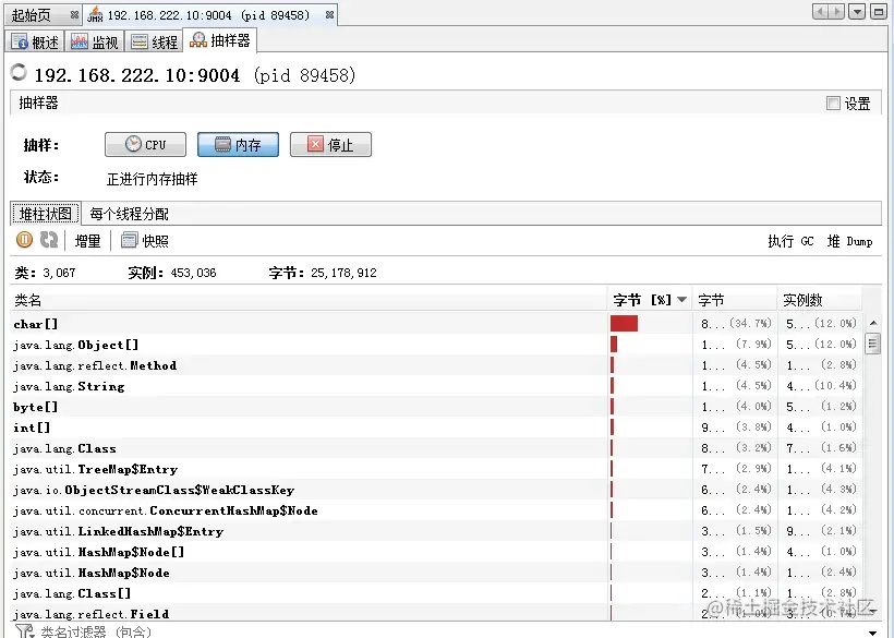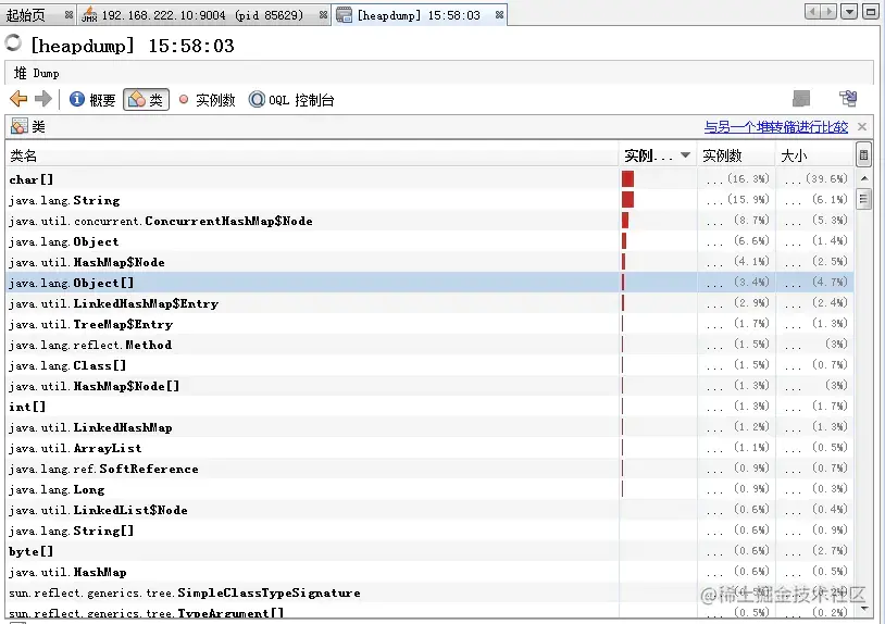 dump出的堆快照,我们可以手动把文件下载下来,然后使用它的“装入快照”功能加载到jvisualvm(装入时需要选择文件类型是以"hprof"类型),进一步分析堆的内存情况。装入后,会包含概要信息,类和实例占用内存情况,双击类还可以看到具体的实例数,若是发现某些类的实例数很多,或者占用的内存大小比较高,则可以知道问题所在。如下所示: