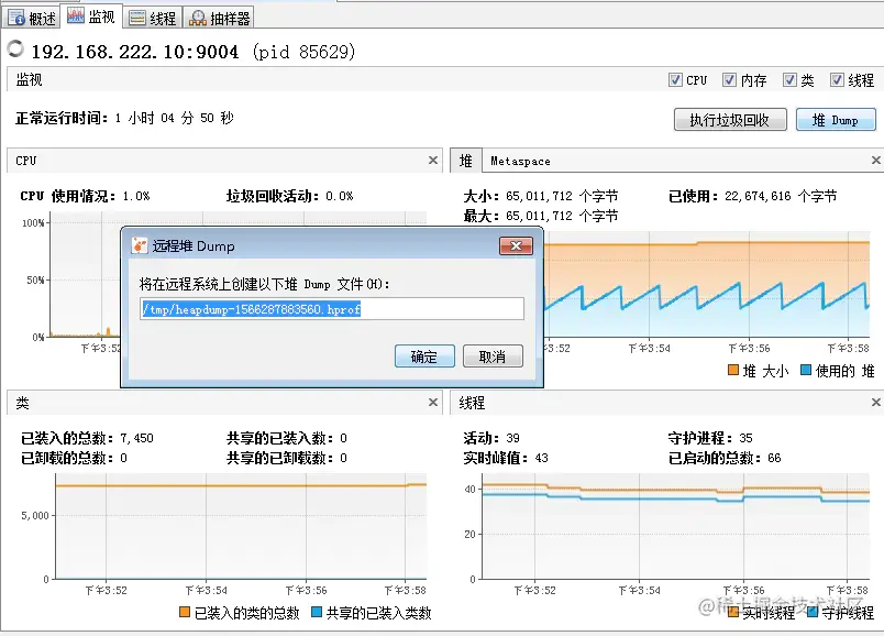 此功能相当于jconsole的"概览"功能,同样是以图形化的方式,显示CPU、堆变化、线程数变化及加载类情况,但它有一个功能是可以远程dump出堆转储快照(相当于jmap -dump:file=./heap.hprof PID),dump时会选择文件存储位置。