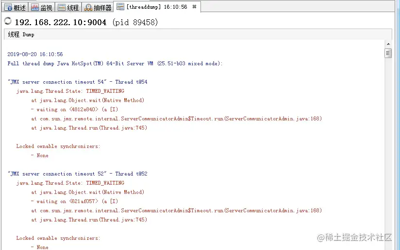 此此功能相当于jconsole的"线程"功能,但更丰富,它把每个线程的运行状态,运行时间都以图形化的方式显示,同时还可以进行远程线程dump,这个功能,其实就是jstack -l功能,dump出来后,直接显示到界面中。如下: