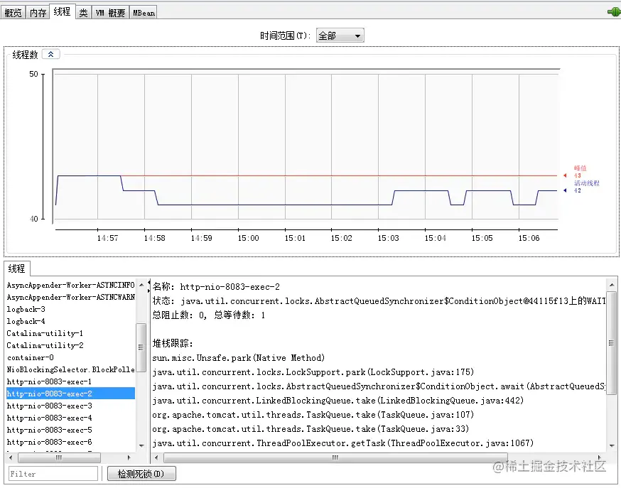 线程数变化情况及点击某个线程查看运行状态来分析,其中还可以点击“检测死锁”功能来处理死锁问题。