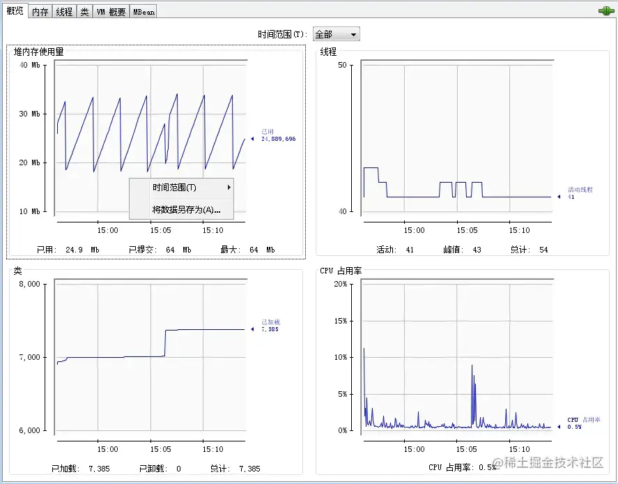 概览主要显示堆,线程数,类,CPU占用率的变化折线图,基本上可以直接根据折线图来查看应用概况。如果堆占用内存很高,活动线程数很多,CPU占用率很高,那就可以直接进入到相应的区域看详细内容来查找原因了。另外,右击对应的图,可以把数据导出到csv文件来分析。如图: