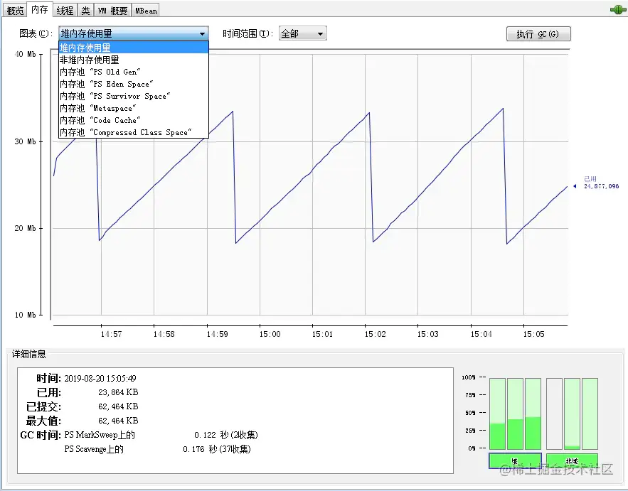 其中,图的上方可以选择查看哪个内存的变化(堆、非堆,old区,eden区,survivor区,metaspace区等),也可以手动执行GC查看变化情况。图下方有显示内存的大小及使用大小,GC的次数和使用时间,同时以柱状图的方式来显示堆和非堆的变化。因此,对于有内存溢出,OOM这些问题,看这里的监测数据非常适合。