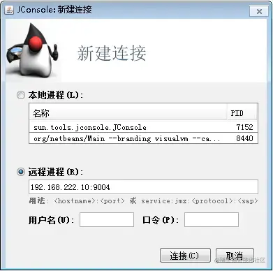 jconsole启动时,会提供两种连接方式,分别是连接本地进程和连接远程进程。它会直接列出本地java进程来选择。若是需要监测远程的java进程,则勾选远程进程,然后输入:。这需要远程的java进程启动时,设置JMX的远程连接参数,否则是无法连接的,关于远程连接的JMX技术,可以参考官方文章(https://docs.oracle.com/javase/8/docs/technotes/guides/management/agent.html)参数分别是以下几个: