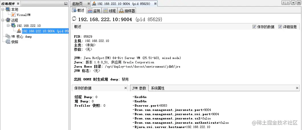跟jconsole一样,jvisualvm可以监测本地的java进程,也可以监测远程的java进程。本地进程直接选择即可,远程进程同样需要java进程添加JMX启动参数。