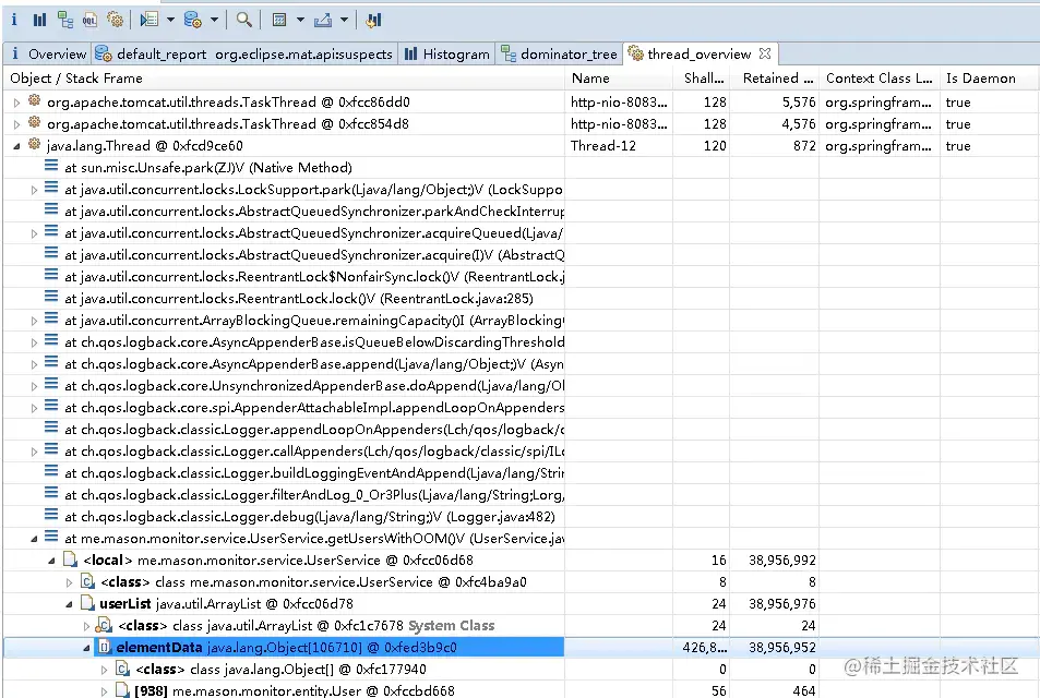在此详细而,Shortest Paths To the Accumulation Point可以显示出到GC roots的最短路径,由此可以分析是由于和哪个GC root相连导致当前Retained Heap占用相当大的对象无法被回收,本示例中,GC root是线程的本地变量(java local)。Accumulated Objects in Dominator Tree以Dominator Tree为视图,可以方便的看出受当前对象“支配”的对象中哪个占用Retained Heap比较大。图中可看出对象都在ArrayList中,而ArrayList下有Object数组,数组下是User对象。此可以知道问题出在哪里了。需要针对这个位置,查看代码,找出导致这个数组存储的User过量的原因。