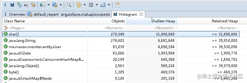 点击Overview页面Actions区域内的“Histogram视图”或点击工具栏的“histogram”按钮,可以显示直方图列表,它以Class类的维度展示每个Class类的实例存在的个数、 占用的Shallow heap 和 Retained内存大小,可以分别排序显示。如下图所示: