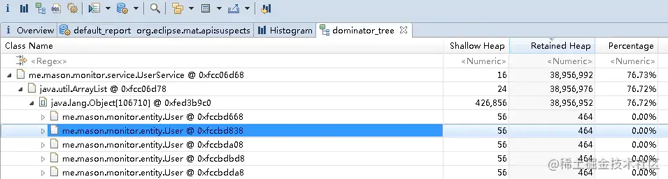 视图展示了实例对象名、Shallow Heap大小、Retained Heap大小、以及当前对象的Retained Heap在整个堆中的占比。该图是树状结构的,当上一级的对象被回收,那么,它引用的子对象都会被回收,这也是Dominator的意义,当父节点的回收会导致子节点也被回收。通过此视图,可以很方便的找出占用Retained Heap内存最多的几个对象,并表示出某些objects的是因为哪些objects的原因而存活。本示例中,可以看出是由于UserService中的ArrayList引用的数组存储过量的User对象。
