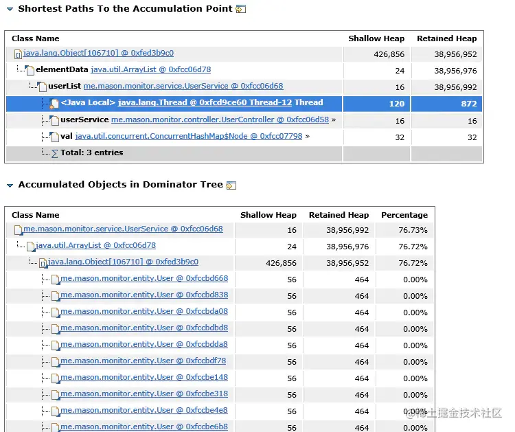 如上图,报告已指出UserService占用了76.73%的内存,而这些内存都在Object[]这个数组中。因此,很大一种可能是这个对象中的数组数量过大。点击Details可以查看更详细的内容: