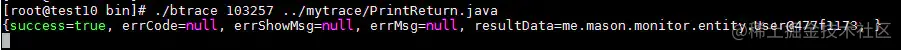 @OnMethod(clazz = "me.mason.monitor.service.UserService" ,method = "getUsers",location = @Location(Kind.RETURN)) public static void printReturnData1(@Return AnyType result){ BTraceUtils.println(BTraceUtils.Time.timestamp("yyyy-MM-dd HH:mm:ss")); BTraceUtils.printFields(result); BTraceUtils.println("=========================="); BTraceUtils.println(BTraceUtils.str(result)); BTraceUtils.println("=========================="); } 复制代码