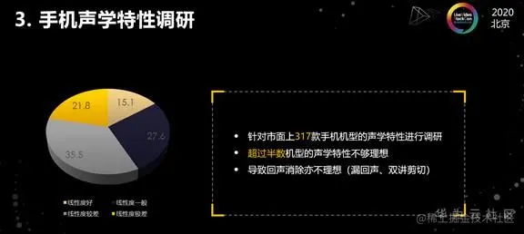 我们之前针对市面上主要的手机机型做过一次调研,主要调查声学特性。结果我们很惊讶地发现,市面上超过半数的手机机型,声学特性不够理想,对应这里面的“较差”和“极差”这两档。我们平时用手机开外音玩游戏,或者语音通话时,经常会出现漏回声问题和双讲剪切问题,就与手机声学特性不佳有直接联系。
