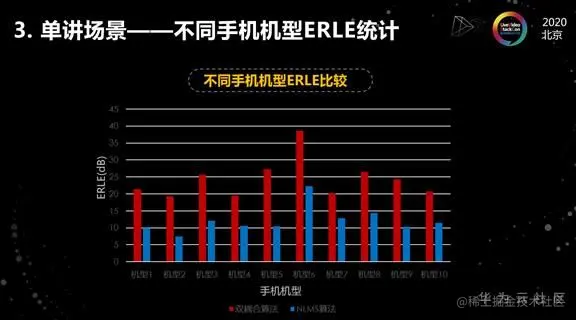 接下来这个图是针对不同手机机型的回声抑制比的比较。红色是双耦合算法,蓝色是NLMS算法,从这组数据里面,我们可以看到双耦合算法比NLMS算法普遍提升了大概10个分贝以上的回声抑制比,具有比较大的优势。