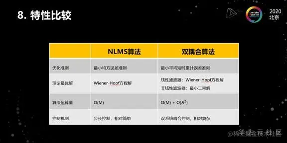 接下来我们对这2个滤波器做了特性比较,主要是从4个不同的维度。首先是优化准则。NLMS算法是基于最小均方误差准则,而双耦合算法是基于最小平均短时累计误差准则,所以他们的优化准则是不一样的。
