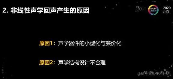 非线性声学回声产生的原因,我一共列了两条原因。原因之一,声学器件的小型化与廉价化,这里所指的声学器件就是前面B里面提到的功率放大器和喇叭。