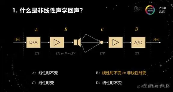 在这里我将整个回声路径分成了A、B、C、D四个部分。我们一起来看一下,ABCD里面哪一个环节最有可能是非线性的?答案应该是B。也就是回声路径里面的功率放大器和喇叭,具体的原因稍后会做详细分析。