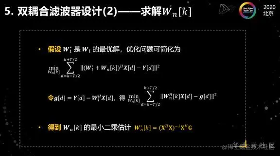 接下来重点介绍了华为云音视频的双耦合声学回声消除算法,我们的主要贡献体现在两个方面,第一个方面就是构建一种双耦合自适应滤波器结构;第二个就是提出了最小平均短时累计误差准则并进行求解。通过求解之后,我们会得到双耦合滤波器的线性滤波器是具有Wiener-Hopf方程解的最优解这种形式,然后非线性滤波器具有最小二乘解。