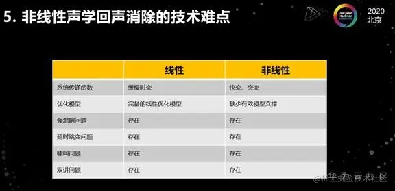 我从6个不同的维度比较了线性和非线性这两种回声消除问题。第一个维度,系统传递函数。在线性系统里面,我们认为系统传递函数是一个缓慢时变的系统,我们可以通过自适应滤波的方式去逼近这个传递函数,来有效抑制回声。而在非线性系统里面,系统传递函数通常是快变、突变的,我们如果用线性的方法去逼近的话,会出现滤波器的更新速度,跟不上系统传递函数变化的速度,就会导致声学回声消除不理想。