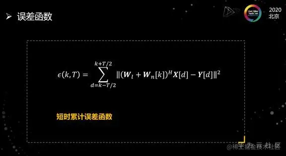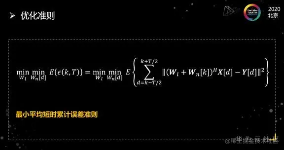 基于这样的误差函数,我们进一步构建了一种新的优化准则,称为“最小平均短时累计误差准则”。我们希望通过优化准则的约束,最后得到的滤波器权系数能够满足两个特性,第一个特性是滤波器在统计意义上能够达到最优,即全局最优,因此我们在目标函数里加入了数学期望运算。同时,我们还希望它在一个短时的观测时间窗的尺度里面也是最优的,即局部最优,所以在数学期望内部,我们又对误差进行了短时积分。